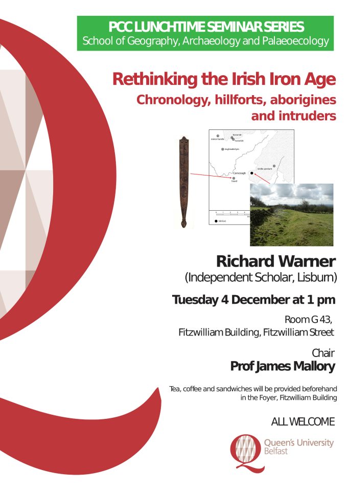 There were no spare seats left in G43 seminar room. Instead, stellar IQs perched on the edges of benches beside microscopes, on tables - anywhere they could get a place to sit. If there’s such a thing as a rock star in Northern Irish archaeology, Richard Warner probably is it. And on December 4th 2012, he arrived in QUB Belfast School of Geography, Archaeology and Paleoecology to challenge us all to rethink the chronology of the Irish Iron Age.