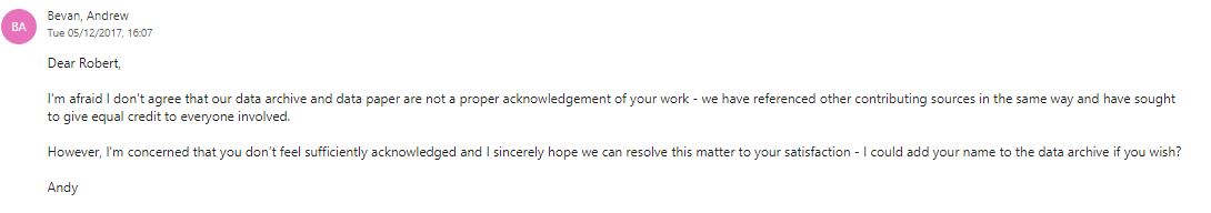 A day later (December 5) Bevan responded to reiterate his belief that my work – and the other similar data sources – had been given the correct level of credit by being placed in the DLC. The final line of his email stated: